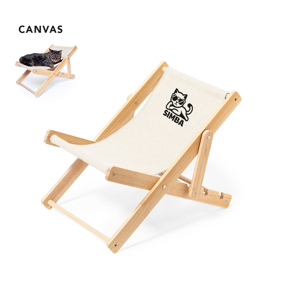 Cadeira para animais de estimação, com estrutura fabricada em madeira sólida e assento em confortável tecido de lona, com acabamento suave e resistente.